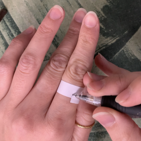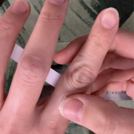 Luego de poner un papel o la cinta adhesiva alrededor de tu dedo mide con una regla el largo.