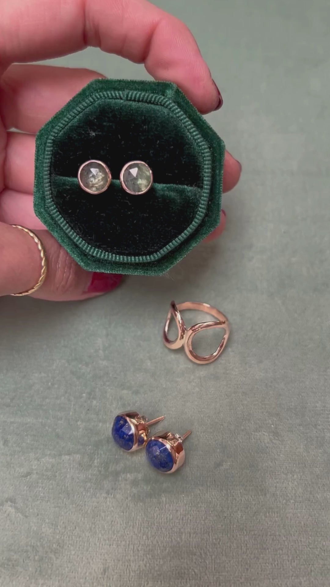 Mónica me escribió contándome que quería hacer dos pares de aritos y un anillo antes de irse a vivir a Londres en tres semanas, preguntando si alcanzaría a tiempo. Me puse manos a la obra y ella me entregó todo su oro, que en este caso era principalmente oro rosa, lo que dio una tonalidad cálida y elegante a las piezas.